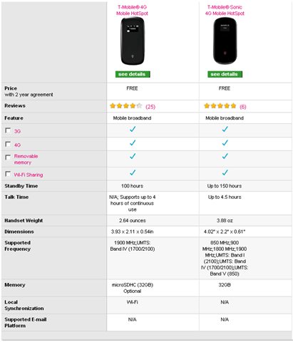 T-Mobile has a couple different Mobile Hot Spots: the T-Mobile 4G Hot Spot and the T-Mobile Sonic 4G Hot Spot. The former is the original mobile hot spot that they have offered. The latter is the newer, updated version. The comparison chart between the two is below.